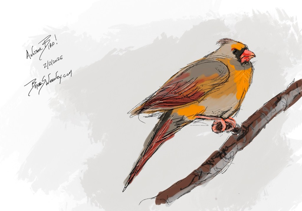 Bird! Share this: Email a link to a friend (Opens in new window) Email Share on X (Opens in new window) X Share on Pinterest (Opens in new window) Pinterest Share on Tumblr (Opens in new window) Tumblr Like Loading... February 11, 2026 by B.X. Sweeney Categories: iPad paintingTags: digitial art, drawing, painting, sketch Leave a comment