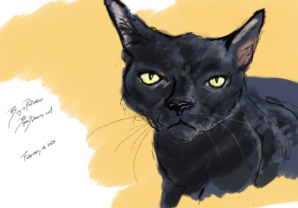 Bug is Displeased Share this: Email a link to a friend (Opens in new window) Email Share on X (Opens in new window) X Share on Pinterest (Opens in new window) Pinterest Share on Tumblr (Opens in new window) Tumblr Like Loading... February 16, 2026 by B.X. Sweeney Categories: iPad paintingTags: cat, drawing, life drawing, sketch Leave a comment