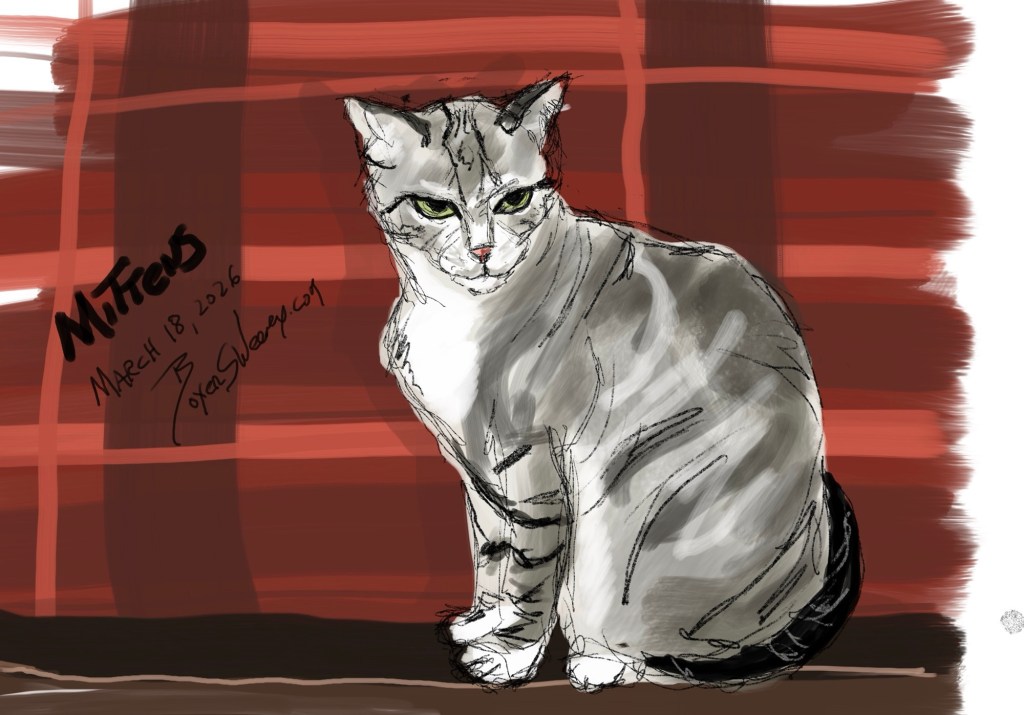 Mittens Share this: Email a link to a friend (Opens in new window) Email Share on X (Opens in new window) X Share on Pinterest (Opens in new window) Pinterest Share on Tumblr (Opens in new window) Tumblr Like Loading... March 18, 2026 by B.X. Sweeney Categories: iPad drawingTags: cat, digital art, drawing, life drawing Leave a comment