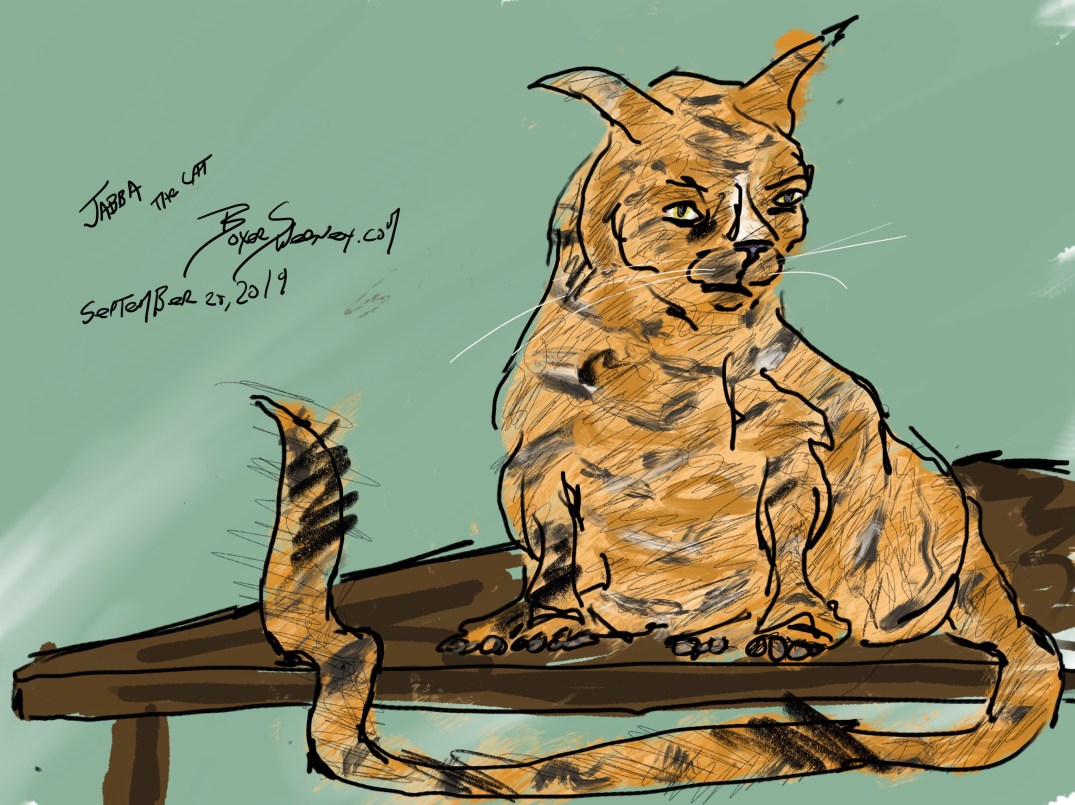 Jabba the Cat Share this: Click to email a link to a friend (Opens in new window) Email Click to share on X (Opens in new window) X Click to share on Pinterest (Opens in new window) Pinterest Click to share on Tumblr (Opens in new window) Tumblr Like Loading... Related September 25, 2019 by B.X. Sweeney Categories: iPad paintingTags: digital art, drawing, ipad drawing, sketch Leave a comment