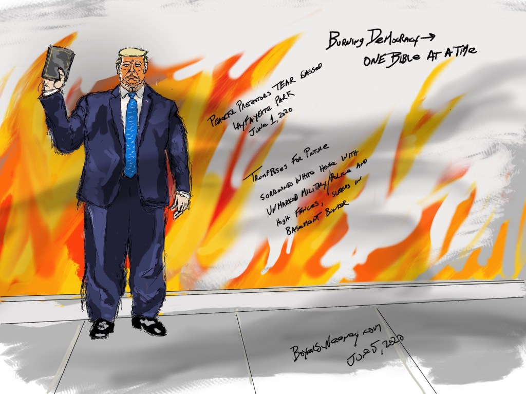 Burning Democracy One Bible at a Time Share this: Click to email a link to a friend (Opens in new window) Email Click to share on X (Opens in new window) X Click to share on Pinterest (Opens in new window) Pinterest Click to share on Tumblr (Opens in new window) Tumblr Like Loading... Related June 5, 2020 by B.X. Sweeney Categories: iPad paintingTags: babygate, bunkerboy, donald trump, ipad drawing, Lafayette, protest Leave a comment