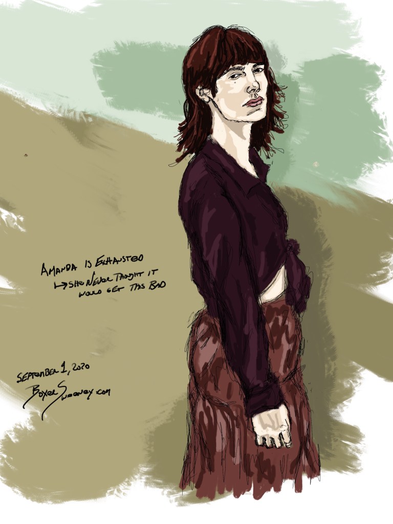 Amanda is Exhausted Share this: Click to email a link to a friend (Opens in new window) Email Click to share on X (Opens in new window) X Click to share on Pinterest (Opens in new window) Pinterest Click to share on Tumblr (Opens in new window) Tumblr Like Loading... Related September 1, 2020 by B.X. Sweeney Categories: iPad paintingTags: digital art, drawing, figure drawing, ipad drawing, portrait Leave a comment