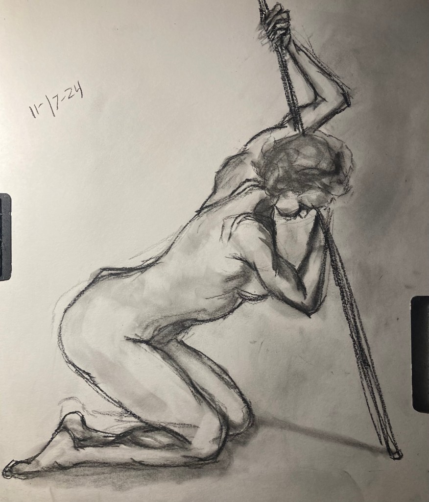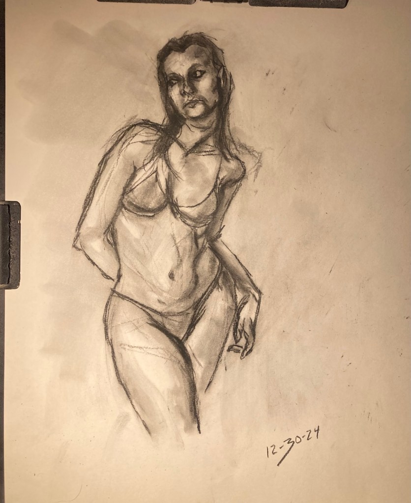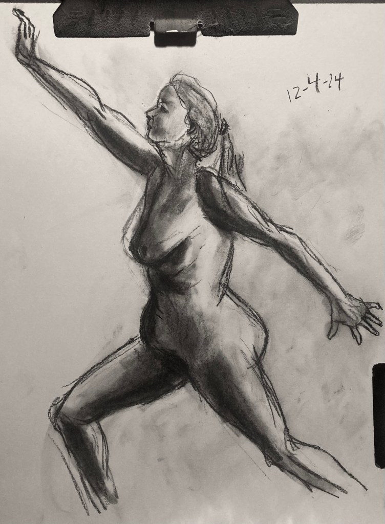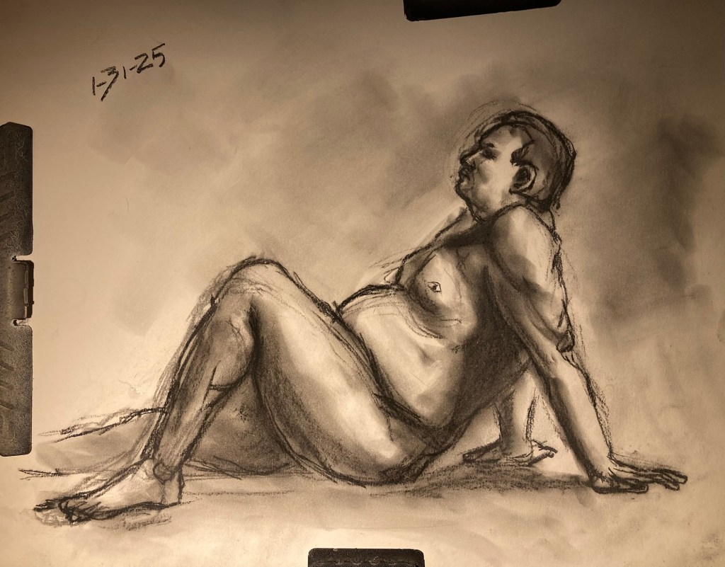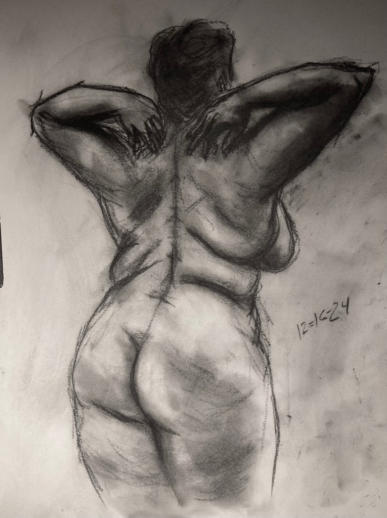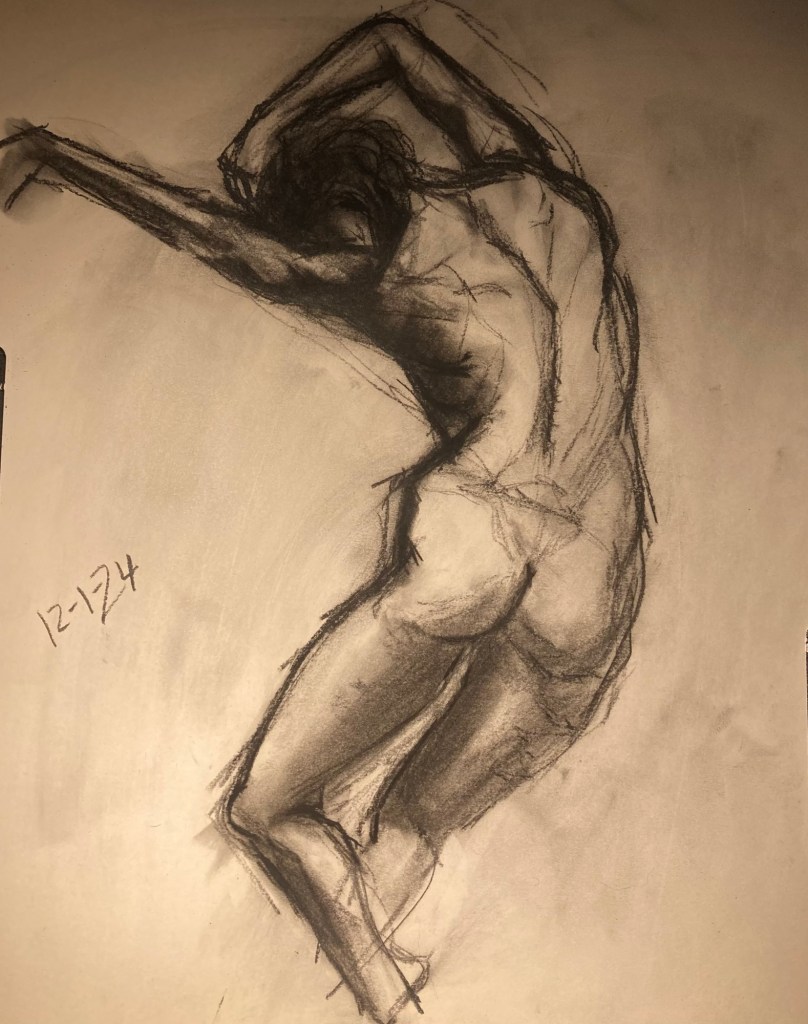 Share this: Click to email a link to a friend (Opens in new window) Email Click to share on X (Opens in new window) X Click to share on Pinterest (Opens in new window) Pinterest Click to share on Tumblr (Opens in new window) Tumblr Like Loading... January 6, 2025 by B.X. Sweeney Categories: charcoalTags: drawing, figure drawing, life drawing Leave a comment