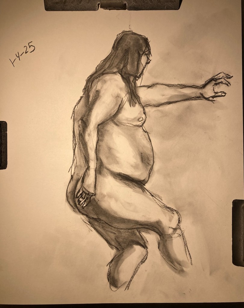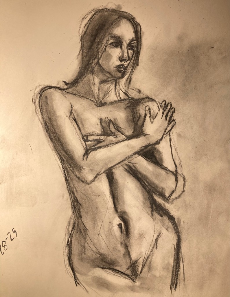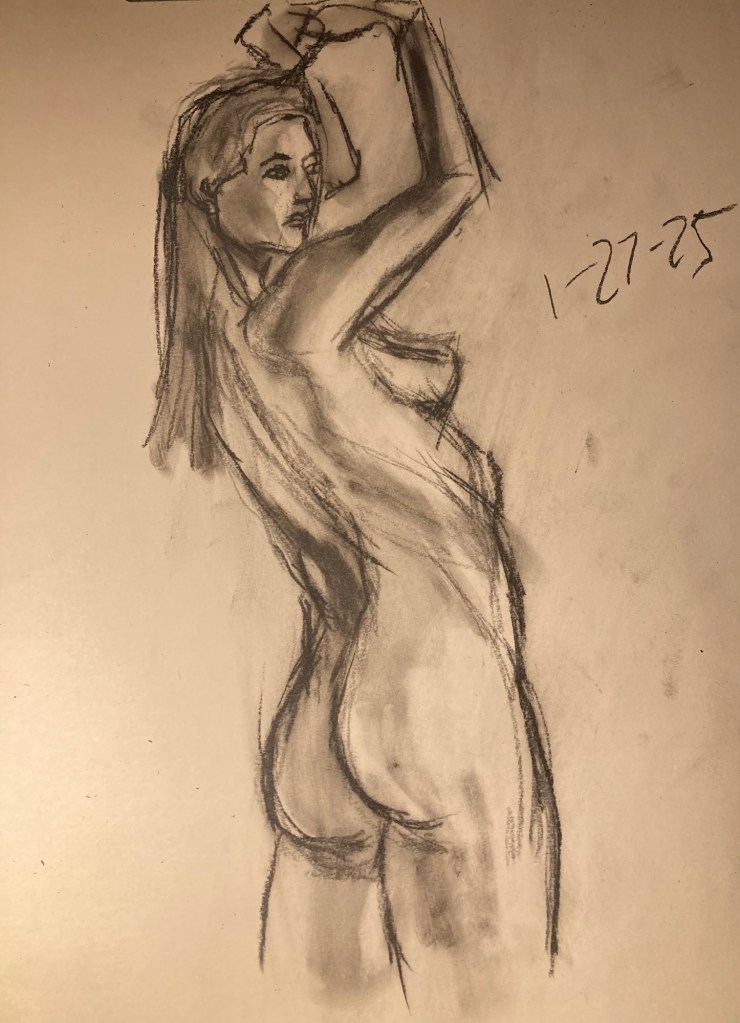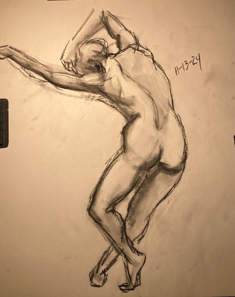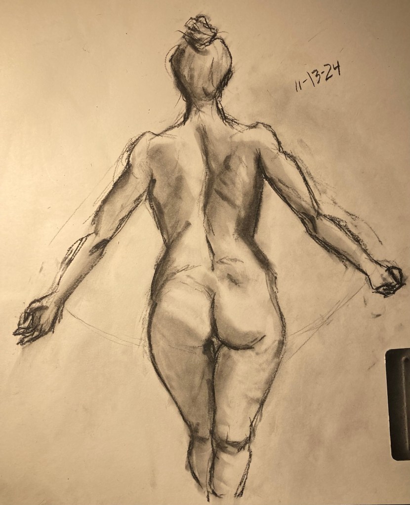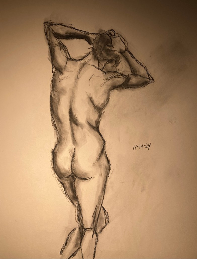 Share this: Click to email a link to a friend (Opens in new window) Email Click to share on X (Opens in new window) X Click to share on Pinterest (Opens in new window) Pinterest Click to share on Tumblr (Opens in new window) Tumblr Like Loading... January 6, 2025 by B.X. Sweeney Categories: charcoalTags: drawing, figure drawing, life drawing Leave a comment