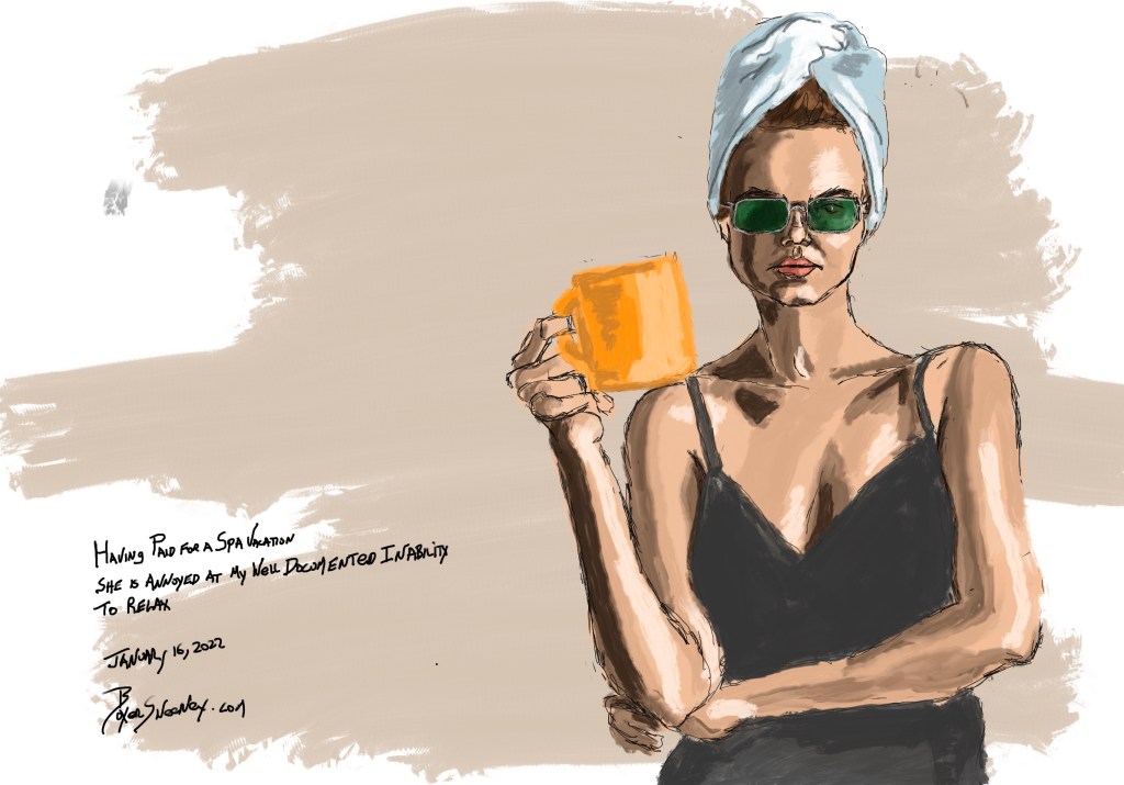 Having Paid for a Spa Vacation, She is Annoyed at my Well Documented Inability to Relax Share this: Click to email a link to a friend (Opens in new window) Email Click to share on X (Opens in new window) X Click to share on Pinterest (Opens in new window) Pinterest Click to share on Tumblr (Opens in new window) Tumblr Like Loading... January 16, 2022 by B.X. Sweeney Categories: iPad painting, procreateTags: digital art, figure drawing, ipad drawing, portrait Leave a comment