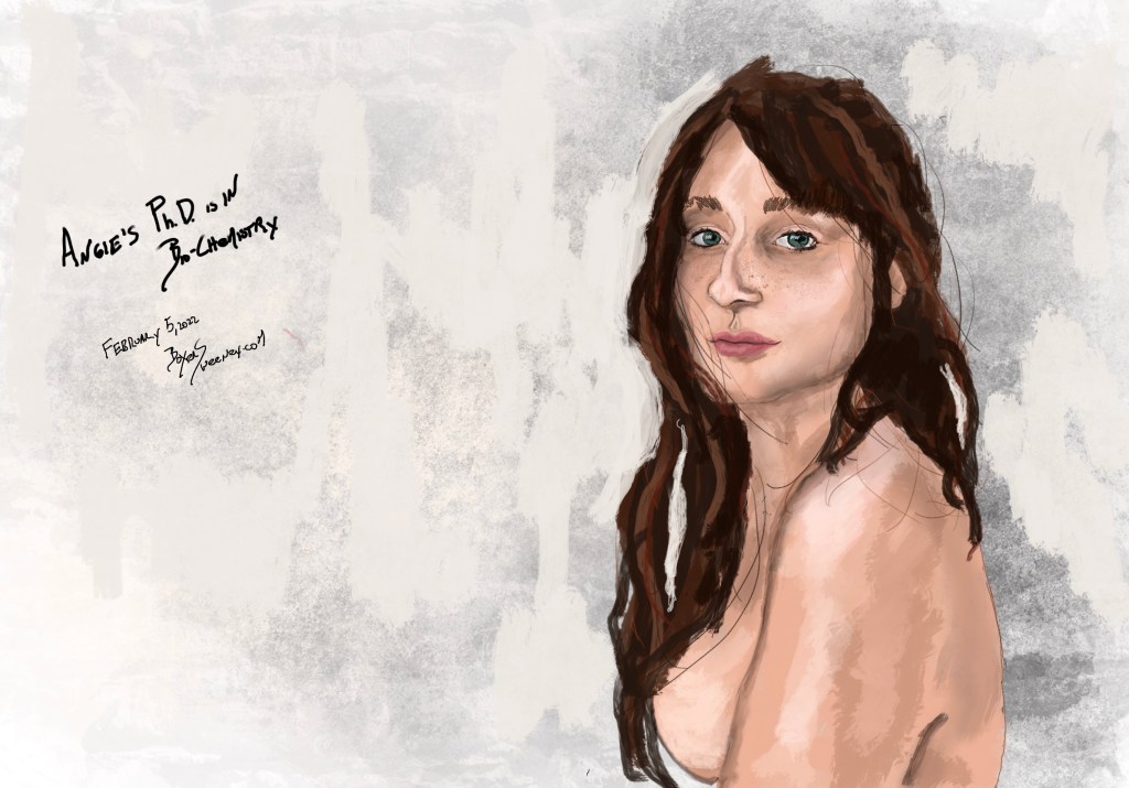 Angie’s Ph.D is in Bio-Chemistry Share this: Click to email a link to a friend (Opens in new window) Email Click to share on X (Opens in new window) X Click to share on Pinterest (Opens in new window) Pinterest Click to share on Tumblr (Opens in new window) Tumblr Like Loading... February 6, 2022 by B.X. Sweeney Categories: iPad painting, procreateTags: digital art, figure drawing, ipad drawing, life drawing, portrait Leave a comment