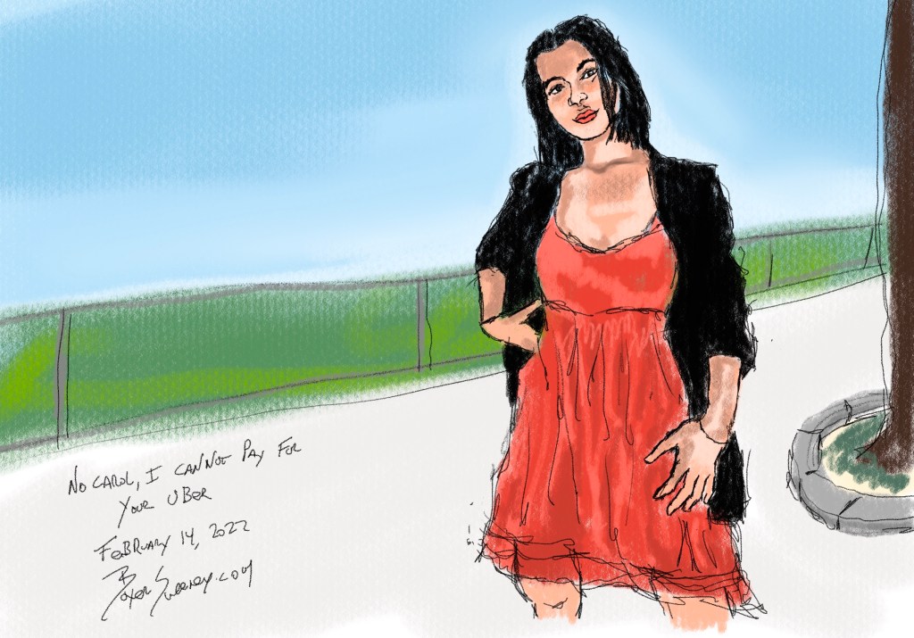 No Carol, I Cannot Pay for Your Uber Share this: Click to email a link to a friend (Opens in new window) Email Click to share on X (Opens in new window) X Click to share on Pinterest (Opens in new window) Pinterest Click to share on Tumblr (Opens in new window) Tumblr Like Loading... February 14, 2022 by B.X. Sweeney Categories: iPad painting, procreateTags: digital art, figure drawing, ipad drawing, portrait Leave a comment