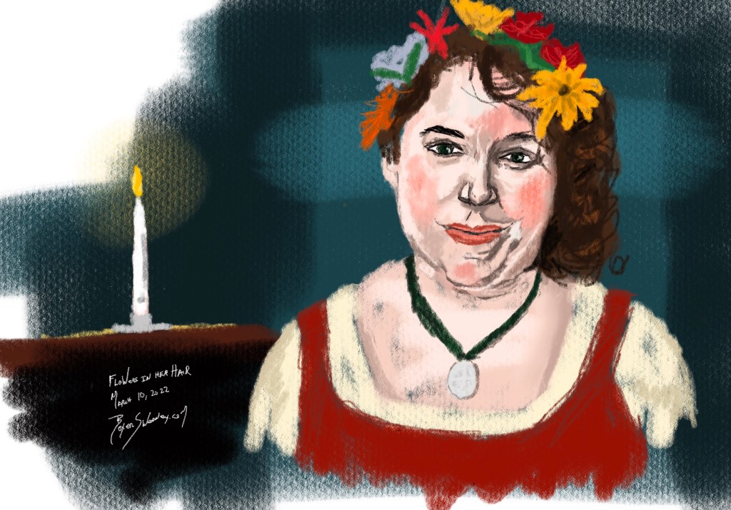 Flowers in her Hair Share this: Click to email a link to a friend (Opens in new window) Email Click to share on X (Opens in new window) X Click to share on Pinterest (Opens in new window) Pinterest Click to share on Tumblr (Opens in new window) Tumblr Like Loading... March 10, 2022 by B.X. Sweeney Categories: iPad painting, procreateTags: digital art, figure drawing, ipad drawing, portrait Leave a comment
