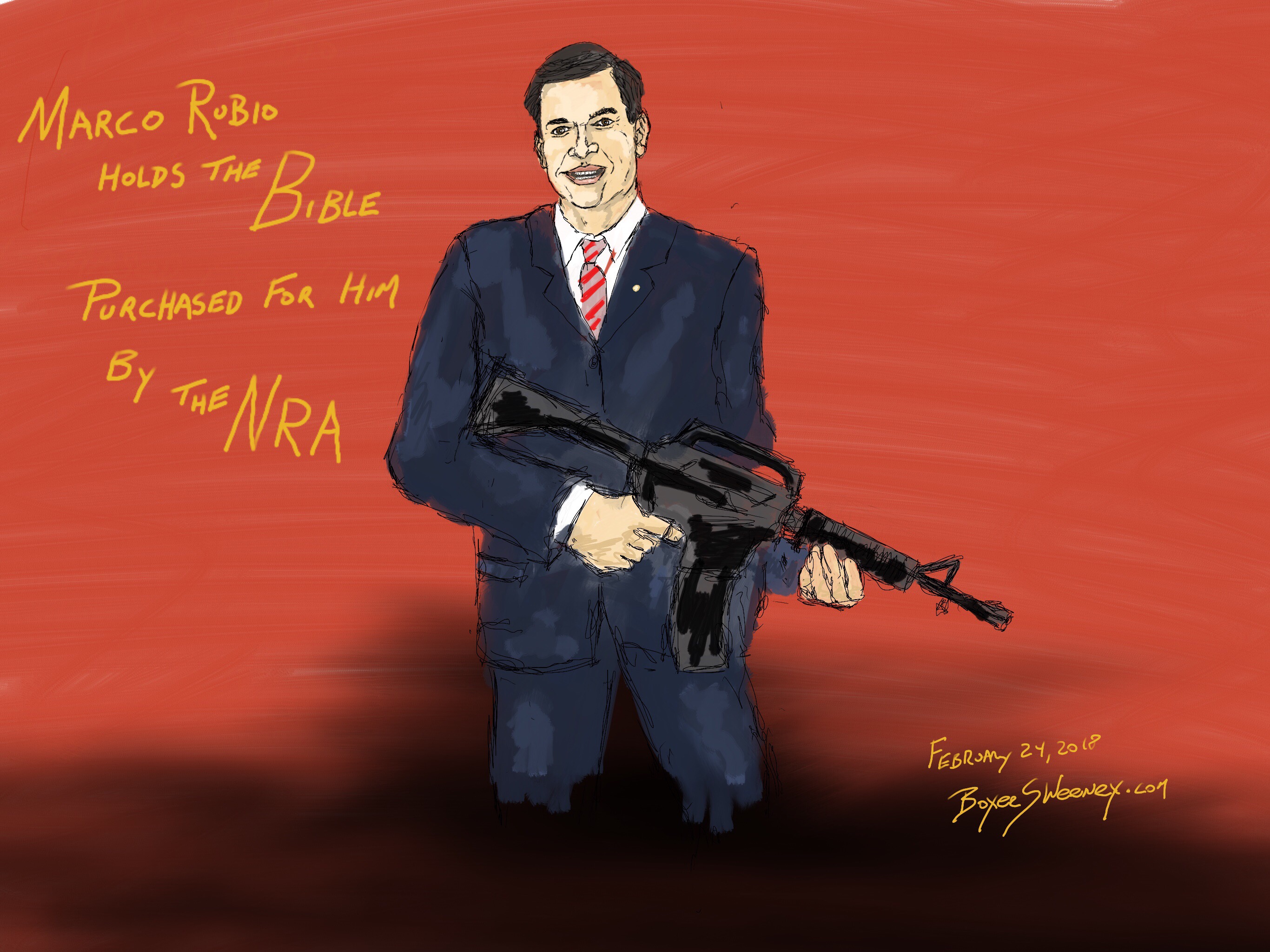 Marco Rubio Holds the Bible Purchased for him by the NRA Share this: Click to email a link to a friend (Opens in new window) Email Click to share on X (Opens in new window) X Click to share on Pinterest (Opens in new window) Pinterest Click to share on Tumblr (Opens in new window) Tumblr Like Loading... February 25, 2018 by B.X. Sweeney Categories: iPad paintingTags: #neveragain, gun control, Marco Rubio, nra 3 Comments