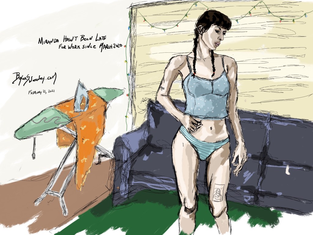Miranda Hasn’t Been Late for Work Since March 2020 Share this: Click to email a link to a friend (Opens in new window) Email Click to share on X (Opens in new window) X Click to share on Pinterest (Opens in new window) Pinterest Click to share on Tumblr (Opens in new window) Tumblr Like Loading... February 21, 2021 by B.X. Sweeney Categories: iPad paintingTags: digital art, drawing, figure drawing, ipad drawing, portrait, sketch Leave a comment