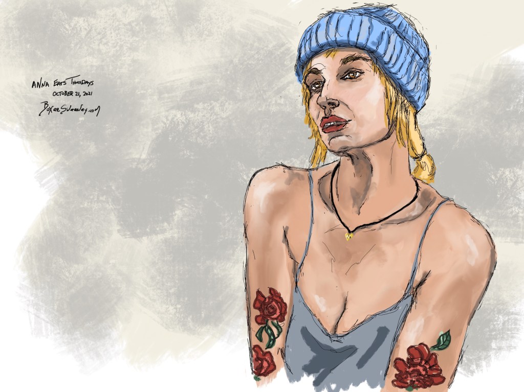 Anna Eats Thursdays Share this: Click to email a link to a friend (Opens in new window) Email Click to share on X (Opens in new window) X Click to share on Pinterest (Opens in new window) Pinterest Click to share on Tumblr (Opens in new window) Tumblr Like Loading... October 21, 2021 by B.X. Sweeney Categories: iPad paintingTags: digital art, drawing, figure drawing, ipad drawing, sketch Leave a comment