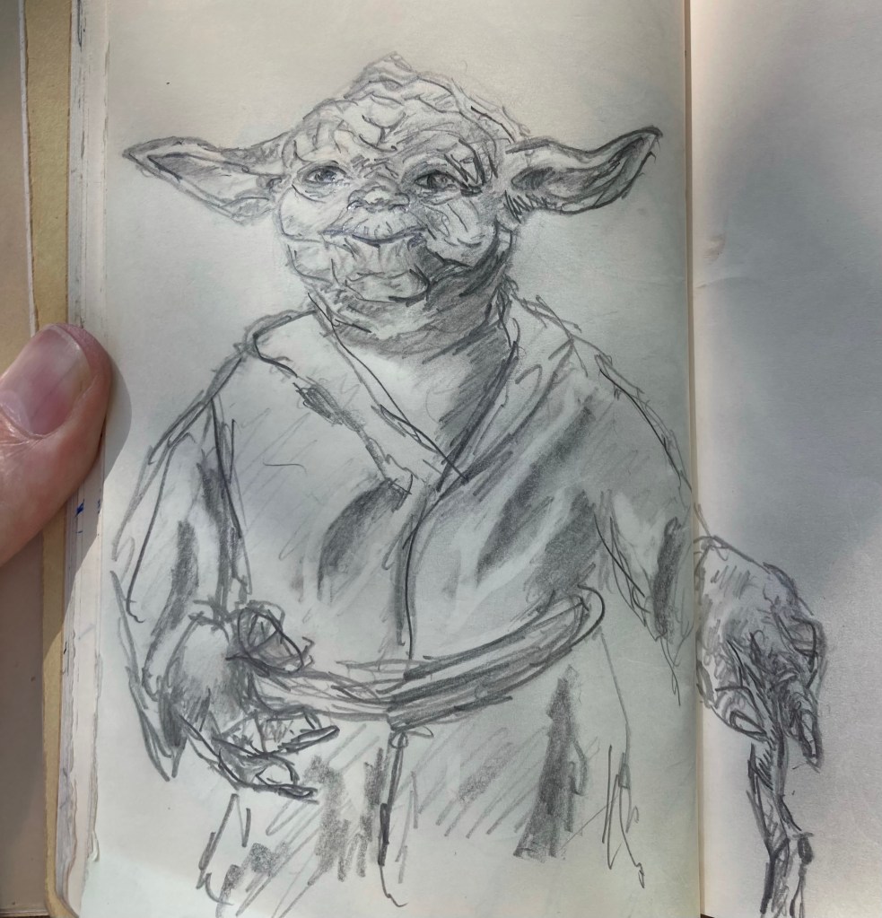 Sketchbook Yoda Share this: Click to email a link to a friend (Opens in new window) Email Click to share on X (Opens in new window) X Click to share on Pinterest (Opens in new window) Pinterest Click to share on Tumblr (Opens in new window) Tumblr Like Loading... June 27, 2022 by B.X. Sweeney Categories: pencil sketchTags: drawing, sketch, sketchbook, star wars Leave a comment