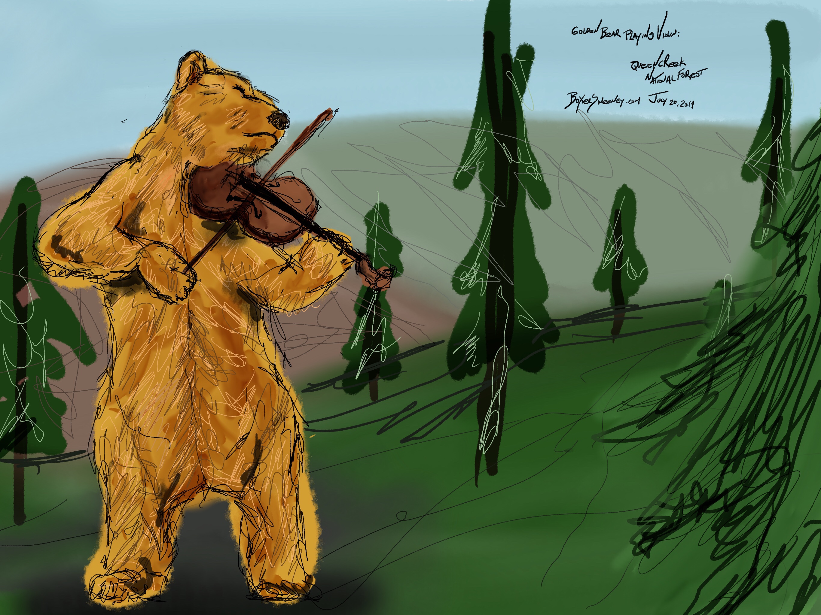 Golden Bear Playing Violin: Queen Creek National Forest Share this: Click to email a link to a friend (Opens in new window) Email Click to share on X (Opens in new window) X Click to share on Pinterest (Opens in new window) Pinterest Click to share on Tumblr (Opens in new window) Tumblr Like Loading... July 20, 2019 by B.X. Sweeney Categories: iPad paintingTags: digital art, drawing, ipad drawing, painting, sketch Leave a comment