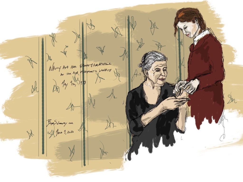 Nancy and her Great Grandmother at Tom and Margaret’s Wedding, May 9th 1978 Share this: Click to email a link to a friend (Opens in new window) Email Click to share on X (Opens in new window) X Click to share on Pinterest (Opens in new window) Pinterest Click to share on Tumblr (Opens in new window) Tumblr Like Loading... March 9, 2020 by B.X. Sweeney Categories: iPad paintingTags: digital art, drawing, figure drawing, ipad drawing, portrait, sketch Leave a comment