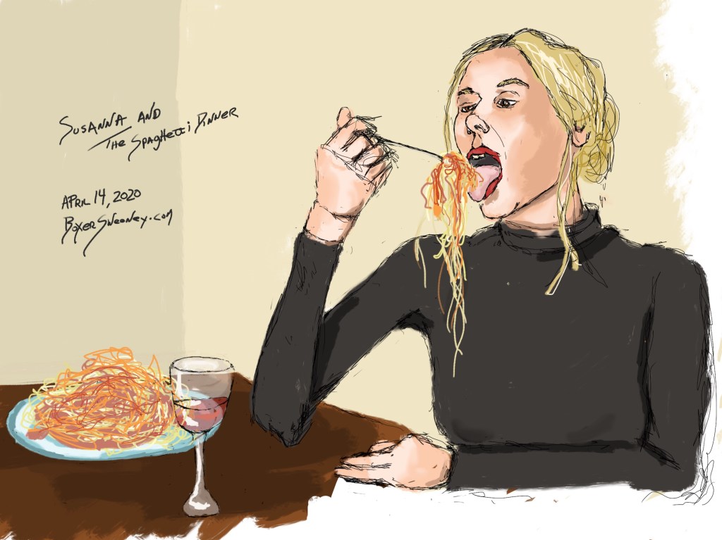 Susanna and the Spaghetti Dinner Share this: Click to email a link to a friend (Opens in new window) Email Click to share on X (Opens in new window) X Click to share on Pinterest (Opens in new window) Pinterest Click to share on Tumblr (Opens in new window) Tumblr Like Loading... April 14, 2020 by B.X. Sweeney Categories: iPad paintingTags: digital art, drawing, figure drawing, ipad drawing, portrait, sketch Leave a comment