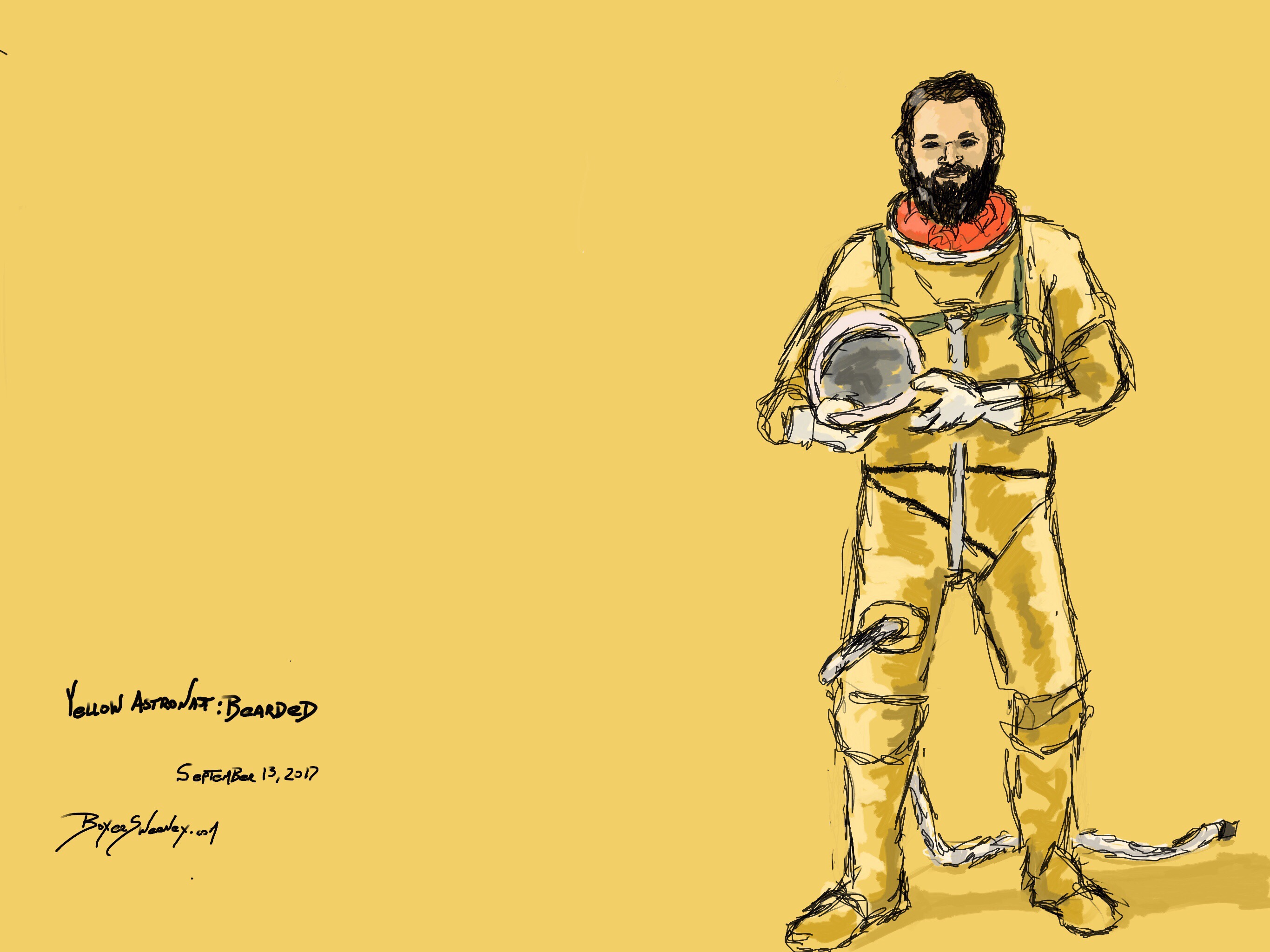 Yellow Astronaut: Bearded Share this: Click to email a link to a friend (Opens in new window) Email Click to share on X (Opens in new window) X Click to share on Pinterest (Opens in new window) Pinterest Click to share on Tumblr (Opens in new window) Tumblr Like Loading... September 13, 2017 by B.X. Sweeney Categories: iPad paintingTags: digital art, figure drawing, ipad drawing, sketch, yellow Leave a comment