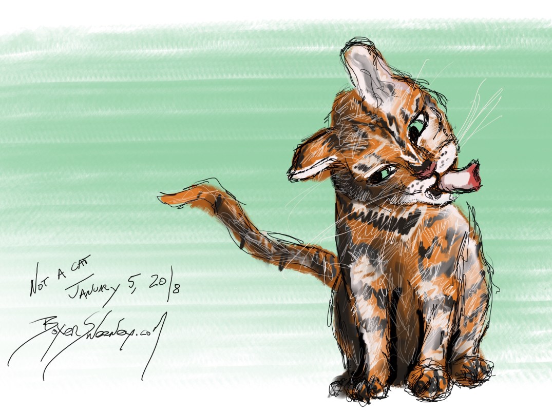 Not a Cat Share this: Click to email a link to a friend (Opens in new window) Email Click to share on X (Opens in new window) X Click to share on Pinterest (Opens in new window) Pinterest Click to share on Tumblr (Opens in new window) Tumblr Like Loading... January 5, 2019 by B.X. Sweeney Categories: iPad paintingTags: digital art, ipad drawing, sketch Leave a comment