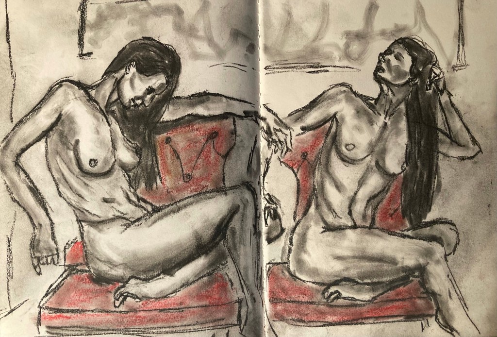 C-11 Two Red Chairs Share this: Click to email a link to a friend (Opens in new window) Email Click to share on X (Opens in new window) X Click to share on Pinterest (Opens in new window) Pinterest Click to share on Tumblr (Opens in new window) Tumblr Like Loading... January 19, 2023 by B.X. Sweeney Categories: charcoal sketchTags: figure drawing, life drawing, nude, sketch, sketchbook Leave a comment