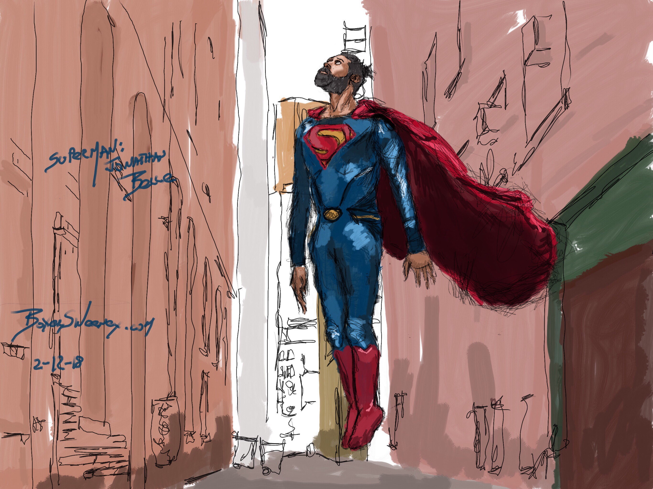 Superman: Jonathan Belle Share this: Click to email a link to a friend (Opens in new window) Email Click to share on X (Opens in new window) X Click to share on Pinterest (Opens in new window) Pinterest Click to share on Tumblr (Opens in new window) Tumblr Like Loading... February 12, 2018 by B.X. Sweeney Categories: iPad paintingTags: digital art, ipad drawing, Jonathan Belle, superheros, superman Leave a comment